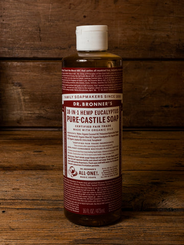 Dr. Bronner’s 18-in-1 Pure-Castile Soaps are good for just about any cleaning task. Face, body, hair & dishes, laundry, mopping, pets—clean your house and body with no synthetic preservatives, detergents or foaming agents—none! Dilute! Dilute! OK!! Need recipes? Read Lisa Bronner's Liquid Soaps Dilutions Cheat Sheet.