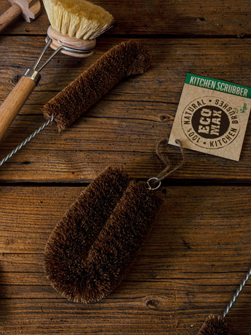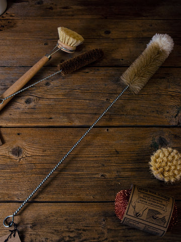 Handmade from natural unbleached coconut fibre head and galvanised wire handle, so it won't rust. Coconut is a sustainable vegetable fibre from the husk of the mature coconut, is tough, lightweight and naturally antibacterial so won’t become smelly or mouldy. The bristles are long-lasting and resist flattening with use. The rounded end means it easily cleans deep into the corners of bottles.